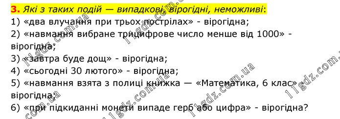 Які з таких подій — випадкові, вірогідні, неможливі: 1) «два влучання при трьох пострілах» - вірогідна; 2) «навмання вибране трицифрове число менше від 1000» - вірогідна; 3) «завтра буде дощ» - вірогідна; 4) «сьогодні 30 лютого» - вірогідна; 5) «навмання взята з полиці книжка — «Математика, 6 клас» - вірогідна; 6) «при підкиданні монети випаде герб або цифра» - вірогідна?