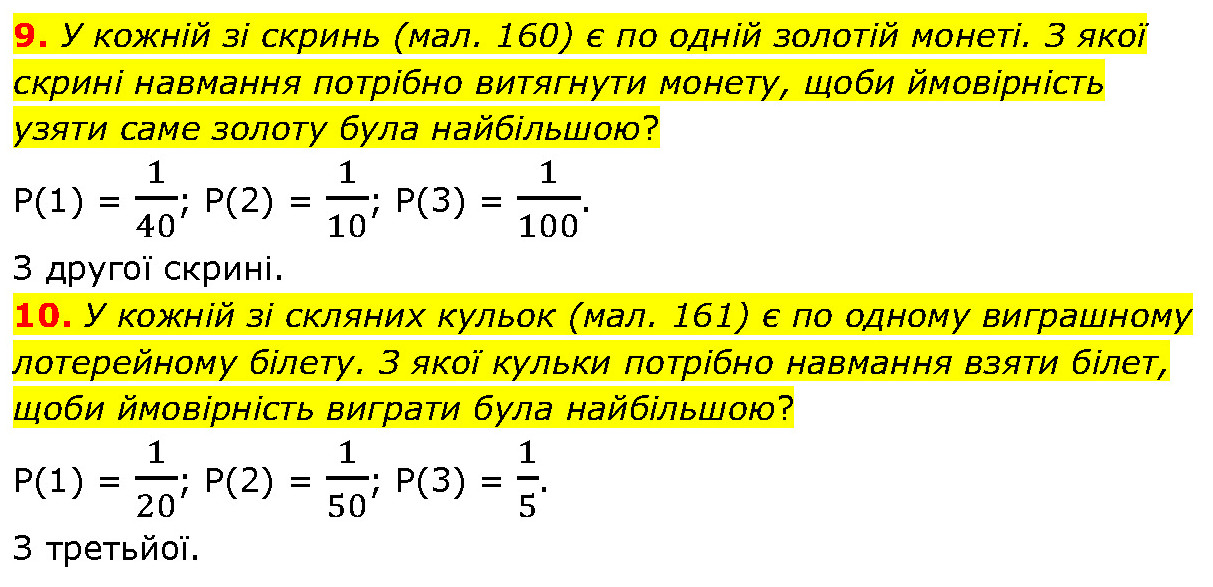 9. У кожній зі скринь (мал. 160) є по одній золотій монеті. З якої скрині навмання потрібно витягнути монету, щоби ймовірність узяти саме золоту була найбільшою? P(1) = 1/40; P(2) = 1/10; P(3) = 1/100. З другої скрині. 10. У кожній зі скляних кульок (мал. 161) є по одному виграшному лотерейному білету. З якої кульки потрібно навмання взяти білет, щоби ймовірність виграти була найбільшою? P(1) = 1/20; P(2) = 1/50; P(3) = 1/5. З третьйої.