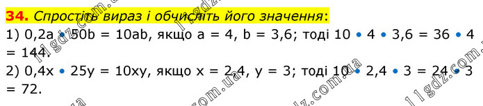 Спростіть вираз і обчисліть його значення: 1) 0,2а • 50b = 10ab, якщо а = 4, b = 3,6; тоді 10 • 4 • 3,6 = 36 • 4 = 144. 2) 0,4х • 25у = 10ху, якщо х = 2,4, у = 3; тоді 10 • 2,4 • 3 = 24 • 3 = 72.
