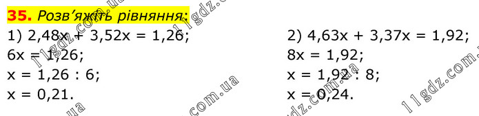 Розв’яжіть рівняння: 1) 2,48х + 3,52х = 1,26; 6х = 1,26; х = 1,26 : 6; х = 0,21. 2) 4,63х + 3,37х = 1,92; 8х = 1,92; х = 1,92 : 8; х = 0,24.