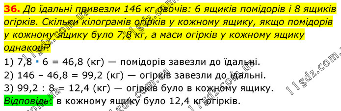 До їдальні привезли 146 кг овочів: 6 ящиків помідорів і 8 ящиків огірків. Скільки кілограмів огірків у кожному ящику, якщо помідорів у кожному ящику було 7,8 кг, а маси огірків у кожному ящику однакові? 1) 7,8 ∙ 6 = 46,8 (кг) — помідорів завезли до їдальні. 2) 146 – 46,8 = 99,2 (кг) — огірків завезли до їдальні. 3) 99,2 : 8 = 12,4 (кг) — огірків було в кожному ящику. Відповідь: в кожному ящику було 12,4 кг огірків.