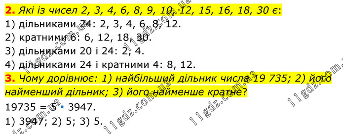 2. Які із чисел 2, 3, 4, 6, 8, 9, 10, 12, 15, 16, 18, 30 є: 1) дільниками 24: 2, 3, 4, 6, 8, 12. 2) кратними 6: 6, 12, 18, 30. 3) дільниками 20 і 24: 2, 4. 4) дільниками 24 і кратними 4: 8, 12. 3. Чому дорівнює: 1) найбільший дільник числа 19 735; 2) його найменший дільник; 3) його найменше кратне? 19735 = 5 ∙ 3947. 1) 3947; 2) 5; 3) 5.
