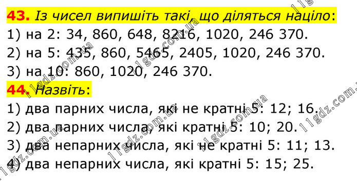 43. Із чисел випишіть такі, що діляться націло: 1) на 2: 34, 860, 648, 8216, 1020, 246 370. 2) на 5: 435, 860, 5465, 2405, 1020, 246 370. 3) на 10: 860, 1020, 246 370. 44. Назвіть: 1) два парних числа, які не кратні 5: 12; 16. 2) два парних числа, які кратні 5: 10; 20. 3) два непарних числа, які не кратні 5: 11; 13. 4) два непарних числа, які кратні 5: 15; 25.