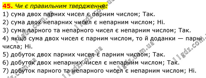 Чи є правильним твердження: 1) сума двох парних чисел є парним числом; Так. 2) сума двох непарних чисел є непарним числом; Ні. 3) сума парного та непарного чисел є непарним числом; Так. 4) якщо сума двох чисел є парним числом, то й доданки — парні числа; Ні. 5) добуток двох парних чисел є парним числом; Так. 6) добуток двох непарних чисел є непарним числом; Так. 7) добуток парного та непарного чисел є непарним числом; Ні.