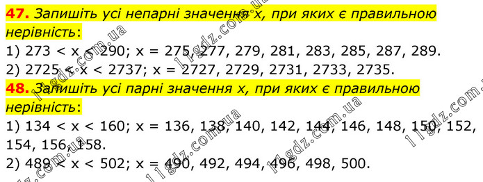 47. Запишіть усі непарні значення х, при яких є правильною нерівність: 1) 273 < х < 290; х = 275, 277, 279, 281, 283, 285, 287, 289. 2) 2725 < х < 2737; х = 2727, 2729, 2731, 2733, 2735. 48. Запишіть усі парні значення х, при яких є правильною нерівність: 1) 134 < х < 160; х = 136, 138, 140, 142, 144, 146, 148, 150, 152, 154, 156, 158. 2) 489 < х < 502; х = 490, 492, 494, 496, 498, 500.