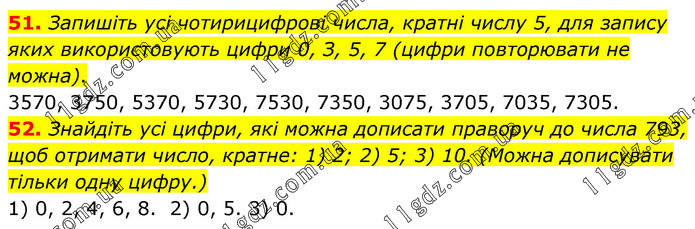 51. Запишіть усі чотирицифрові числа, кратні числу 5, для запису яких використовують цифри 0, З, 5, 7 (цифри повторювати не можна). 3570, 3750, 5370, 5730, 7530, 7350, 3075, 3705, 7035, 7305. 52. Знайдіть усі цифри, які можна дописати праворуч до числа 793, щоб отримати число, кратне: 1) 2; 2) 5; 3) 10. (Можна дописувати тільки одну цифру.) 1) 0, 2, 4, 6, 8. 2) 0, 5. 3) 0.