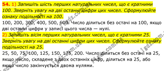 54. 1) Запишіть шість перших натуральних чисел, що є кратними 100. Зверніть увагу на дві останні цифри цих чисел. Сформулюйте ознаку подільності на 100. 100, 200, 300, 400, 500, 600. Число ділиться без остачі на 100, якщо дві останні цифри у записі цього числа — нулі. 2) Запишіть вісім перших натуральних чисел, що є кратними 25. Зверніть увагу на дві останні цифри цих чисел. Сформулюйте ознаку подільності на 25. 25, 50, 75, 100, 125, 150, 175, 200. Число ділиться без остачі на 25, якщо число, складене з двох останніх цифр, ділиться на 25, або якщо число закінчується двома нулями.