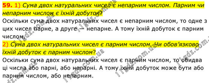 1) Сума двох натуральних чисел є непарним числом. Парним чи непарним числом є їхній добуток? Оскільки сума двох натуральних чисел є непарним числом, то одне з цих чисел парне, а друге — непарне. А тому їхній добуток є парним числом. 2) Сума двох натуральних чисел є парним числом. Чи обов’язково їхній добуток є парним числом? Оскільки сума двох натуральних чисел є парним числом, то обидва ці числа або парні, або непарні. А тому їхній добуток може бути або парним числом, або непарним.