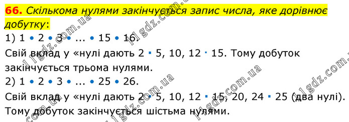 Скількома нулями закінчується запис числа, яке дорівнює добутку: 1) 1 • 2 • 3 • ... • 15 • 16. Свій вклад у «нулі дають 2 ∙ 5, 10, 12 ∙ 15. Тому добуток закінчується трьома нулями. 2) 1 • 2 • 3 • ... • 25 • 26. Свій вклад у «нулі дають 2 ∙ 5, 10, 12 ∙ 15, 20, 24 ∙ 25 (два нулі). Тому добуток закінчується шістьма нулями.