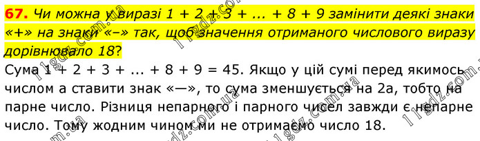 Чи можна у виразі 1 + 2 + 3 + ... + 8 + 9 замінити деякі знаки «+» на знаки «–» так, щоб значення отриманого числового виразу дорівнювало 18? Сума 1 + 2 + 3 + ... + 8 + 9 = 45. Якщо у цій сумі перед якимось числом а ставити знак «—», то сума зменшується на 2а, тобто на парне число. Різниця непарного і парного чисел завжди є непарне число. Тому жодним чином ми не отримаємо число 18.