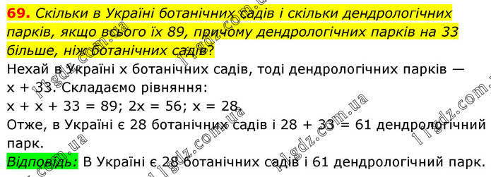 Скільки в Україні ботанічних садів і скільки дендрологічних парків, якщо всього їх 89, причому дендрологічних парків на 33 більше, ніж ботанічних садів? Нехай в Україні х ботанічних садів, тоді дендрологічних парків — х + 33. Складаємо рівняння: х + х + 33 = 89; 2х = 56; х = 28. Отже, в Україні є 28 ботанічних садів і 28 + 33 = 61 дендрологічний парк. Відповідь: В Україні є 28 ботанічних садів і 61 дендрологічний парк.