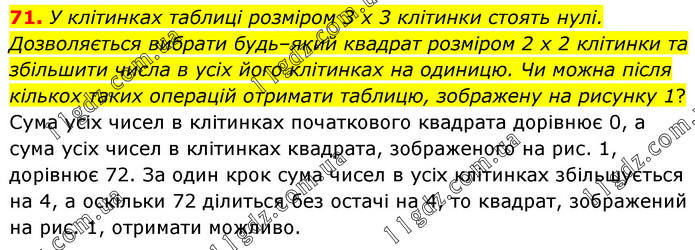 У клітинках таблиці розміром 3 x 3 клітинки стоять нулі. Дозволяється вибрати будь–який квадрат розміром 2 x 2 клітинки та збільшити числа в усіх його клітинках на одиницю. Чи можна після кількох таких операцій отримати таблицю, зображену на рисунку 1? Сума усіх чисел в клітинках початкового квадрата дорівнює 0, а сума усіх чисел в клітинках квадрата, зображеного на рис. 1, дорівнює 72. За один крок сума чисел в усіх клітинках збільшується на 4, а оскільки 72 ділиться без остачі на 4, то квадрат, зображений на рис. 1, отримати можливо.