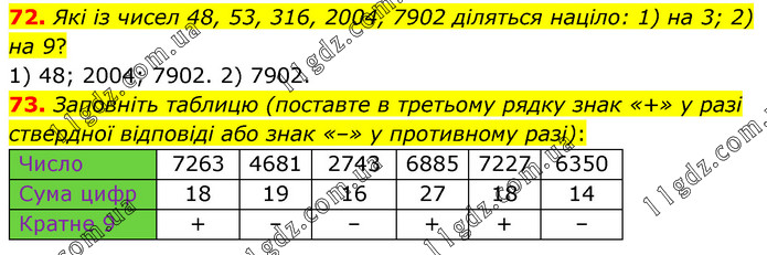 72. Які із чисел 48, 53, 316, 2004, 7902 діляться націло: 1) на 3; 2) на 9? 1) 48; 2004; 7902. 2) 7902. 73. Заповніть таблицю (поставте в третьому рядку знак «+» у разі ствердної відповіді або знак «–» у противному разі):
