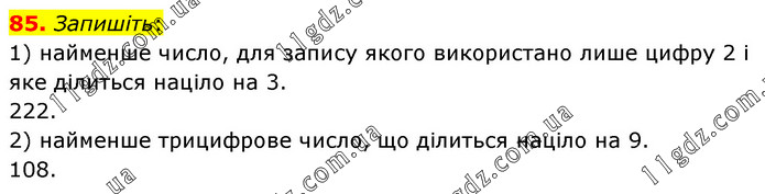 85. Запишіть: 1) найменше число, для запису якого використано лише цифру 2 і яке ділиться націло на 3. 222. 2) найменше трицифрове число, що ділиться націло на 9. 108.