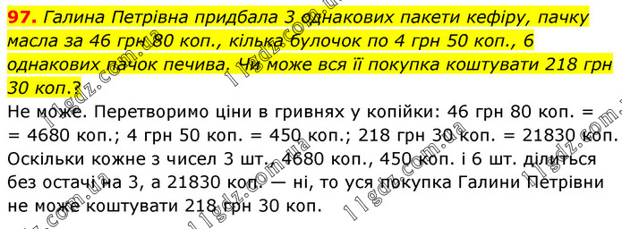 Галина Петрівна придбала 3 однакових пакети кефіру, пачку масла за 46 грн 80 коп., кілька булочок по 4 грн 50 коп., 6 однакових пачок печива. Чи може вся її покупка коштувати 218 грн 30 коп.? Не може. Перетворимо ціни в гривнях у копійки: 46 грн 80 коп. = = 4680 коп.; 4 грн 50 коп. = 450 коп.; 218 грн 30 коп. = 21830 коп. Оскільки кожне з чисел 3 шт., 4680 коп., 450 коп. і 6 шт. ділиться без остачі на 3, а 21830 коп. — ні, то уся покупка Галини Петрівни не може коштувати 218 грн 30 коп.