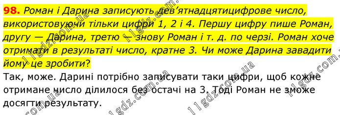 Роман і Дарина записують дев’ятнадцятицифрове число, використовуючи тільки цифри 1, 2 і 4. Першу цифру пише Роман, другу — Дарина, третю — знову Роман і т. д. по черзі. Роман хоче отримати в результаті число, кратне 3. Чи може Дарина завадити йому це зробити? Так, може. Дарині потрібно записувати таки цифри, щоб кожне отримане число ділилося без остачі на 3. Тоді Роман не зможе досягти результату.