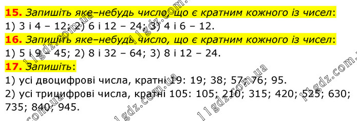 15. Запишіть яке–небудь число, що є кратним кожного із чисел: 1) 3 і 4 – 12; 2) 6 і 12 – 24; 3) 4 і 6 – 12. 16. Запишіть яке–небудь число, що є кратним кожного із чисел: 1) 5 і 9 – 45; 2) 8 і 32 – 64; 3) 8 і 12 – 24. 17. Запишіть: 1) усі двоцифрові числа, кратні 19: 19; 38; 57; 76; 95. 2) усі трицифрові числа, кратні 105: 105; 210; 315; 420; 525; 630; 735; 840; 945.