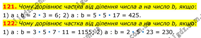 121. Чому дорівнює частка від ділення числа а на число b, якщо: 1) а : b = 2 ∙ 3 = 6; 2) а : b = 5 ∙ 5 ∙ 17 = 425. 122. Чому дорівнює частка від ділення числа а на число b, якщо: 1) а : b = 3 ∙ 5 ∙ 7 ∙ 11 = 1155; 2) а : b = 2 ∙ 5 ∙ 23 = 230.