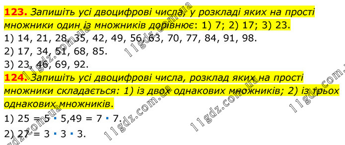 123. Запишіть усі двоцифрові числа, у розкладі яких на прості множники один із множників дорівнює: 1) 7; 2) 17; 3) 23. 1) 14, 21, 28, 35, 42, 49, 56, 63, 70, 77, 84, 91, 98. 2) 17, 34, 51, 68, 85. 3) 23, 46, 69, 92. 124. Запишіть усі двоцифрові числа, розклад яких на прості множники складається: 1) із двох однакових множників; 2) із трьох однакових множників. 1) 25 = 5 ∙ 5,49 = 7 ∙ 7. 2) 27 = 3 ∙ 3 ∙ 3.