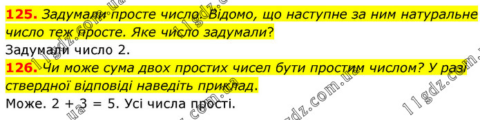 125. Задумали просте число. Відомо, що наступне за ним натуральне число теж просте. Яке число задумали? Задумали число 2. 126. Чи може сума двох простих чисел бути простим числом? У разі ствердної відповіді наведіть приклад. Може. 2 + 3 = 5. Усі числа прості.