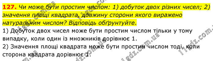 127. Чи може бути простим числом: 1) добуток двох різних чисел; 2) значення площі квадрата, довжину сторони якого виражено натуральним числом? Відповідь обґрунтуйте. 1) Добуток двох чисел може бути простим числом тільки у тому випадку, коли один із множників дорівнює 1. 2) Значення площі квадрата може бути простим числом тоді, коли сторона квадрата дорівнює 1.