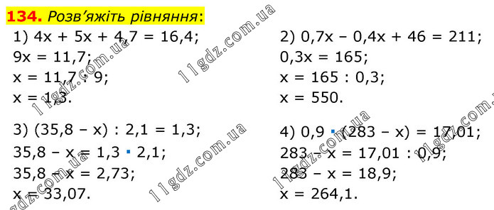 Розв’яжіть рівняння: 1) 4х + 5х + 4,7 = 16,4; 9х = 11,7; х = 11,7 : 9; х = 1,3. 2) 0,7х – 0,4х + 46 = 211; 0,3х = 165; х = 165 : 0,3; х = 550. 3) (35,8 – х) : 2,1 = 1,3; 35,8 – х = 1,3 ∙ 2,1; 35,8 – х = 2,73; х = 33,07. 4) 0,9 ∙ (283 – х) = 17,01; 283 – х = 17,01 : 0,9; 283 – х = 18,9; х = 264,1.