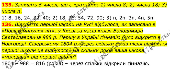 135. Запишіть 5 чисел, що є кратними: 1) числа 8; 2) числа 18; 3) числа n. 1) 8, 16, 24, 32, 40; 2) 18, 36, 54, 72, 90; 3) n, 2n, 3n, 4n, 5n. 136. Відкриття першої школи на Русі відбулося, як записано в «Повісті минулих літ», у Києві за часів князя Володимира Святославовича 988 р. Першу в Україні гімназію було відкрито в Новгороді–Сіверському 1804 р. Через скільки років після відкриття першої школи це відбулося? На скільки років ваша школа «молодша» від першої школи? 1804 – 988 = 816 (років) – через стільки відкрили гімназію.