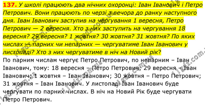 У школі працюють два нічних охоронці: Іван Іванович і Петро Петрович. Вони працюють по черзі з вечора до ранку наступного дня. Іван Іванович заступив на чергування 1 вересня, Петро Петрович — 2 вересня. Хто з них заступить на чергування 18 вересня? 29 вересня? 1 жовтня? 30 жовтня? 31 жовтня? По яких числах — парних чи непарних — чергуватиме Іван Іванович у листопаді? Хто з них чергуватиме в ніч на Новий рік? По парним числам чергує Петро Петрович, по непарним – Іван Іванович, тому: 18 вересня – Петро Петрович; 29 вересня – Іван Іванович; 1 жовтня – Іван Іванович; 30 жовтня – Петро Петрович; 31 жовтня – Іван Іванович. У листопаді Іван Іванович буде чергувати по парних числах. В ніч на Новий Рік буде чергувати Петро Петрович.
