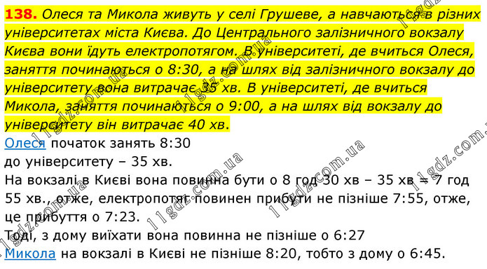 Олеся та Микола живуть у селі Грушеве, а навчаються в різних університетах міста Києва. До Центрального залізничного вокзалу Києва вони їдуть електропотягом. В університеті, де вчиться Олеся, заняття починаються о 8:30, а на шлях від залізничного вокзалу до університету вона витрачає 35 хв. В університеті, де вчиться Микола, заняття починаються о 9:00, а на шлях від вокзалу до університету він витрачає 40 хв. Олеся початок занять 8:30 до університету – 35 хв. На вокзалі в Києві вона повинна бути о 8 год 30 хв – 35 хв = 7 год 55 хв., отже, електропотяг повинен прибути не пізніше 7:55, отже, це прибуття о 7:23. Тоді, з дому виїхати вона повинна не пізніше о 6:27 Микола на вокзалі в Києві не пізніше 8:20, тобто з дому о 6:45.