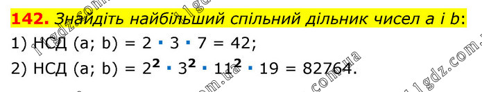 Знайдіть найбільший спільний дільник чисел а і b: 1) НСД (а; b) = 2 ∙ 3 ∙ 7 = 42; 2) НСД (а; b) = 22 ∙ 32 ∙ 112 ∙ 19 = 82764.