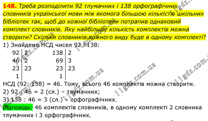 Треба розподілити 92 тлумачних і 138 орфографічних словників української мови між якомога більшою кількістю шкільних бібліотек так, щоб до кожної бібліотеки потрапив однаковий комплект словників. Яку найбільшу кількість комплектів можна створити? Скільки словників кожного виду буде в одному комплекті? 1) Знайдемо НСД чисел 92 і 138: НСД (92; 138) = 46. Тому, всього 46 комплектів можна створити. 2) 92 : 46 = 2 (сл.) – тлумачних; 3) 138 : 46 = 3 (сл.) – орфографічних. Відповідь: 46 комплектів словників, в одному комплекті 2 словника тлумачних і 3 орфографічних.