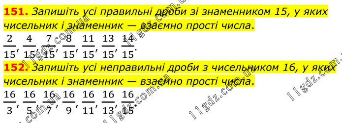 151. Запишіть усі правильні дроби зі знаменником 15, у яких чисельник і знаменник — взаємно прості числа. 2/15, 4/15, 7/15, 8/15, 11/15, 13/15, 14/15. 152. Запишіть усі неправильні дроби з чисельником 16, у яких чисельник і знаменник — взаємно прості числа. 16/3, 16/5, 16/7, 16/9, 16/11, 16/13, 16/15.
