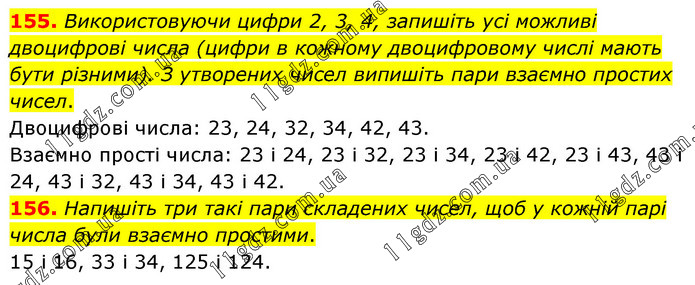 155. Використовуючи цифри 2, 3, 4, запишіть усі можливі двоцифрові числа (цифри в кожному двоцифровому числі мають бути різними). З утворених чисел випишіть пари взаємно простих чисел. Двоцифрові числа: 23, 24, 32, 34, 42, 43. Взаємно прості числа: 23 і 24, 23 і 32, 23 і 34, 23 і 42, 23 і 43, 43 і 24, 43 і 32, 43 і 34, 43 і 42. 156. Напишіть три такі пари складених чисел, щоб у кожній парі числа були взаємно простими. 15 і 16, 33 і 34, 125 і 124.