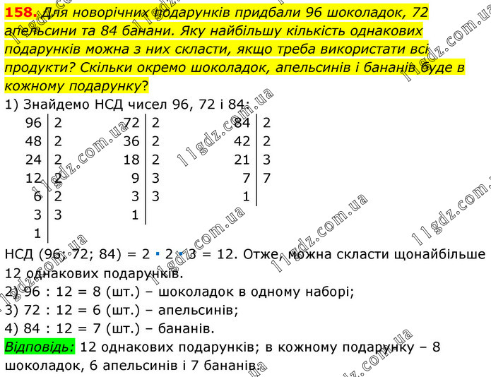 Для новорічних подарунків придбали 96 шоколадок, 72 апельсини та 84 банани. Яку найбільшу кількість однакових подарунків можна з них скласти, якщо треба використати всі продукти? Скільки окремо шоколадок, апельсинів і бананів буде в кожному подарунку? 1) Знайдемо НСД чисел 96, 72 і 84: НСД (96; 72; 84) = 2 ∙ 2 ∙ 3 = 12. Отже, можна скласти щонайбільше 12 однакових подарунків. 2) 96 : 12 = 8 (шт.) – шоколадок в одному наборі; 3) 72 : 12 = 6 (шт.) – апельсинів; 4) 84 : 12 = 7 (шт.) – бананів. Відповідь: 12 однакових подарунків; в кожному подарунку – 8 шоколадок, 6 апельсинів і 7 бананів.