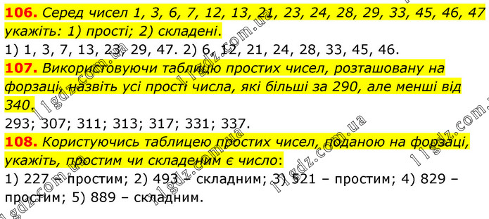 106. Серед чисел 1, 3, 6, 7, 12, 13, 21, 23, 24, 28, 29, 33, 45, 46, 47 укажіть: 1) прості; 2) складені. 1) 1, 3, 7, 13, 23, 29, 47. 2) 6, 12, 21, 24, 28, 33, 45, 46. 107. Використовуючи таблицю простих чисел, розташовану на форзаці, назвіть усі прості числа, які більші за 290, але менші від 340. 293; 307; 311; 313; 317; 331; 337. 108. Користуючись таблицею простих чисел, поданою на форзаці, укажіть, простим чи складеним є число: 1) 227 – простим; 2) 493 – складним; 3) 521 – простим; 4) 829 – простим; 5) 889 – складним.
