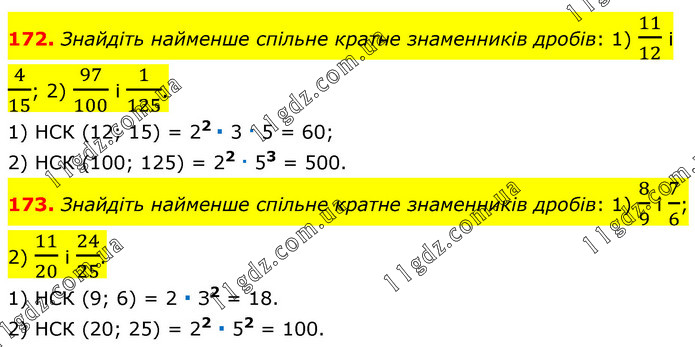 172. Знайдіть найменше спільне кратне знаменників дробів: 1) 11/12 і 4/15; 2) 97/100 і 1/125. 1) НСК (12; 15) = 22 ∙ 3 ∙ 5 = 60; 2) НСК (100; 125) = 22 ∙ 53 = 500. 173. Знайдіть найменше спільне кратне знаменників дробів: 1) 8/9 і 7/6; 2) 11/20 і 24/25. 1) НСК (9; 6) = 2 ∙ З2 = 18. 2) НСК (20; 25) = 22 ∙ 52 = 100.
