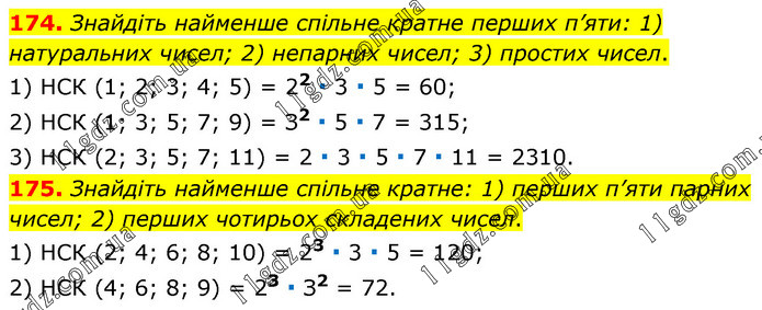 174. Знайдіть найменше спільне кратне перших п’яти: 1) натуральних чисел; 2) непарних чисел; 3) простих чисел. 1) НСК (1; 2; 3; 4; 5) = 22 ∙ 3 ∙ 5 = 60; 2) НСК (1; 3; 5; 7; 9) = З2 ∙ 5 ∙ 7 = 315; 3) НСК (2; 3; 5; 7; 11) = 2 ∙ 3 ∙ 5 ∙ 7 ∙ 11 = 2310. 175. Знайдіть найменше спільне кратне: 1) перших п’яти парних чисел; 2) перших чотирьох складених чисел. 1) НСК (2; 4; 6; 8; 10) = 23 ∙ 3 ∙ 5 = 120; 2) НСК (4; 6; 8; 9) = 23 ∙ З2 = 72.