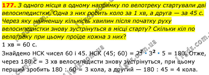 З одного місця в одному напрямку по велотреку стартували дві велосипедистки. Одна з них робить коло за 1 хв, а друга — за 45 с. Через яку найменшу кількість хвилин після початку руху велосипедистки знову зустрінуться в місці старту? Скільки кіл по велотреку при цьому проїде кожна з них? 1 хв = 60 с. Знайдемо НСК чисел 60 і 45. НСК (45; 60) = 22 ∙ З2 ∙ 5 = 180. Отже, через 180 с = 3 хв велосипедисти знову зустрінуться, при цьому перший зробить 180 : 60 = 3 кола, а другий — 180 : 45 = 4 кола.