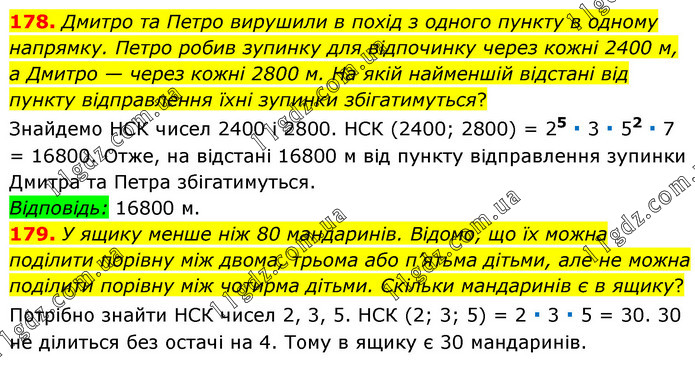178. Дмитро та Петро вирушили в похід з одного пункту в одному напрямку. Петро робив зупинку для відпочинку через кожні 2400 м, а Дмитро — через кожні 2800 м. На якій найменшій відстані від пункту відправлення їхні зупинки збігатимуться? Знайдемо НСК чисел 2400 і 2800. НСК (2400; 2800) = 25 ∙ 3 ∙ 52 ∙ 7 = 16800. Отже, на відстані 16800 м від пункту відправлення зупинки Дмитра та Петра збігатимуться. Відповідь: 16800 м. 179. У ящику менше ніж 80 мандаринів. Відомо, що їх можна поділити порівну між двома, трьома або п’ятьма дітьми, але не можна поділити порівну між чотирма дітьми. Скільки мандаринів є в ящику? Потрібно знайти НСК чисел 2, 3, 5. НСК (2; 3; 5) = 2 ∙ 3 ∙ 5 = 30. 30 не ділиться без остачі на 4. Тому в ящику є 30 мандаринів.