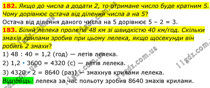 182. Якщо до числа а додати 2, то отримане число буде кратним 5. Чому дорівнює остача від ділення числа а на 5? Остача від ділення даного числа на 5 дорівнює 5 – 2 = 3. 183. Білий лелека пролетів 48 км зі швидкістю 40 км/год. Скільки змахів крилами зробив при цьому лелека, якщо щосекунди він робить 2 змахи? 1) 48 : 40 = 1,2 (год) — летів лелека. 2) 1,2 ∙ 3600 = 4320 (с) — летів лелека. 3) 4320 ∙ 2 = 8640 (раз) — змахнув крилами лелека. Відповідь: лелека за час польоту зробив 8640 змахів крилами.