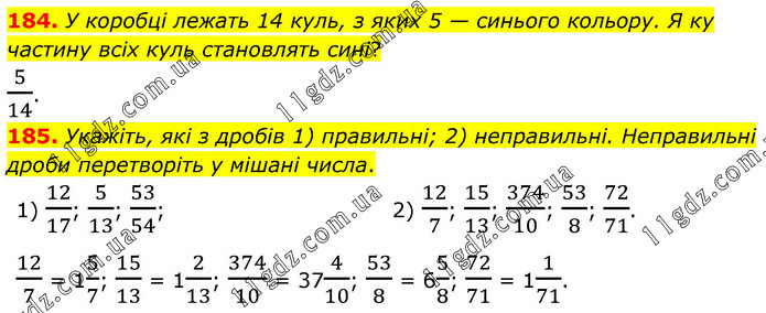 184. У коробці лежать 14 куль, з яких 5 — синього кольору. Я ку частину всіх куль становлять сині? 5/14. 185. Укажіть, які з дробів 1) правильні; 2) неправильні. Неправильні дроби перетворіть у мішані числа. 1) 12/17; 5/13; 53/54; 2) 12/7; 15/13; 374/10; 53/8; 72/71. 12/7 = 15/7; 15/13 = 12/13; 374/10 = 374/10; 53/8 = 65/8; 72/71 = 11/71.