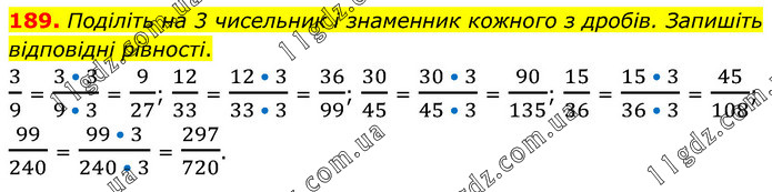 Поділіть на 3 чисельник і знаменник кожного з дробів. Запишіть відповідні рівності. 3/9 = (3 • 3)/(9 • 3) = 9/27; 12/33 = (12 • 3)/(33 • 3) = 36/99; 30/45 = (30 • 3)/(45 • 3) = 90/135; 15/36 = (15 • 3)/(36 • 3) = 45/108; 99/240 = (99 • 3)/(240 • 3) = 297/720.