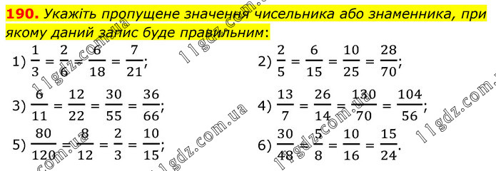 Укажіть пропущене значення чисельника або знаменника, при якому даний запис буде правильним: 1) 1/3 = 2/6 = 6/18 = 7/21; 2) 2/5 = 6/15 = 10/25 = 28/70; 3) 6/11 = 12/22 = 30/55 = 36/66; 4) 13/7 = 26/14 = 130/70 = 104/56; 5) 80/120 = 8/12 = 2/3 = 10/15; 6) 30/48 = 5/8 = 10/16 = 15/24.
