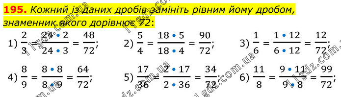 Кожний із даних дробів замініть рівним йому дробом, знаменник якого дорівнює 72: 1) 2/3 = (24 • 2)/(24 • 3) = 48/72; 2) 5/4 = (18 • 5)/(18 • 4) = 90/72; 3) 1/6 = (1 • 12)/(6 • 12) = 12/72; 4) 8/9 = (8 • 8)/(8 • 9) = 64/72; 5) 17/36 = (2 • 17)/(2 • 36) = 34/72; 6) 11/8 = (9 • 11)/(9 • 8) = 99/72;