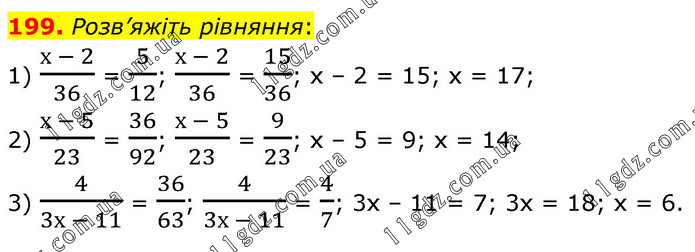 Розв’яжіть рівняння: 1) (х - 2)/36 = 5/12; (х - 2)/36 = 15/36; х – 2 = 15; х = 17; 2) (х - 5)/23 = 36/92; (х - 5)/23 = 9/23; х – 5 = 9; х = 14; 3) 4/(3х - 11) = 36/63; 4/(3х - 11) = 4/7; 3х – 11 = 7; 3х = 18; х = 6.