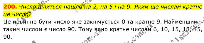 Число ділиться націло на 2, на 5 і на 9. Яким ще числам кратне це число? Це повинно бути число яке закінчується 0 та кратне 9. Найменшим таким числом є число 90. Тому воно кратне числам 6, 10, 15, 18, 45, 90.