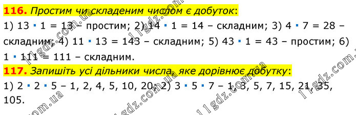116. Простим чи складеним числом є добуток: 1) 13 ∙ 1 = 13 – простим; 2) 14 ∙ 1 = 14 – складним; 3) 4 ∙ 7 = 28 – складним; 4) 11 ∙ 13 = 143 – складним; 5) 43 ∙ 1 = 43 – простим; 6) 1 ∙ 111 = 111 – складним. 117. Запишіть усі дільники числа, яке дорівнює добутку: 1) 2 ∙ 2 ∙ 5 – 1, 2, 4, 5, 10, 20; 2) 3 ∙ 5 ∙ 7 – 1, 3, 5, 7, 15, 21, 35, 105.