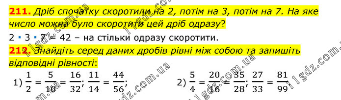 211. Дріб спочатку скоротили на 2, потім на 3, потім на 7. На яке число можна було скоротити цей дріб одразу? 2 ∙ 3 ∙ 7 = 42 – на стільки одразу скоротити. 212. Знайдіть серед даних дробів рівні між собою та запишіть відповідні рівності: 1) 1/2 = 5/10 = 16/32; 11/14 = 44/56; 2) 5/4 = 20/16 = 35/28; 27/33 = 81/99.