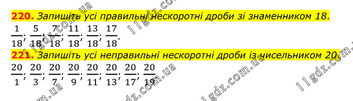 220. Запишіть усі правильні нескоротні дроби зі знаменником 18. 1/18; 5/18; 7/18; 11/18; 13/18; 17/18. 221. Запишіть усі неправильні нескоротні дроби із чисельником 20. 20/1; 20/3; 20/7; 20/9; 20/11; 20/13; 20/17; 20/19.