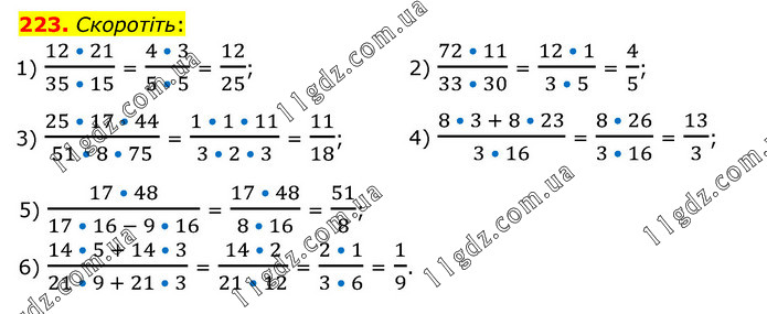 Скоротіть: 1) (12 • 21)/(35 • 15) = (4 • 3)/(5 • 5) = 12/25; 2) (72 • 11)/(33 • 30) = (12 • 1)/(3 • 5) = 4/5; 3) (25 • 17 • 44)/(51 • 8 • 75) = (1 • 1 • 11)/(3 • 2 • 3) = 11/18; 4) (8 • 3 + 8 • 23)/(3 • 16) = (8 • 26)/(3 • 16) = 13/3; 5) (17 • 48)/(17 • 16 - 9 • 16) = (17 • 48)/(8 • 16) = 51/8; 6) (14 • 5 + 14 • 3)/(21 • 9 + 21 • 3) = (14 • 2)/(21 • 12) = (2 • 1)/(3 • 6) = 1/9.